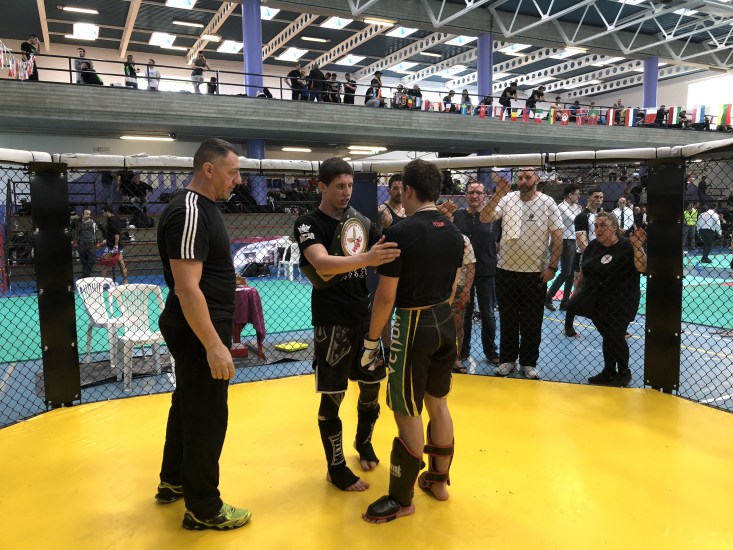 Avec trois ceintures de champion, notre équipe est rentrée à l’hôtel. Le jour suivant, le 8 avril, Adam et Malik ont été présents pour la discipline du MMA Light. Adam est entré dans la cage avec une blessure faite la veille à la cuisse, après un low kick (ce qui montre encore une fois que son adversaire avait frappé durement, sans être averti lui). Bien qu’il fût soigné durant la nuit par de la pommade et des massages, la douleur ne passa pas le matin et Adam boitait. Magomed voulait le retirer de la compétition, mais Adam était surmotivé, sachant qu’il allait rencontrer son adversaire de longue date sur Nice, celui qu’il avait battu en finale du championnat de zone Sud de la France en Pancrace. Il ne voulut pas se déclarer forfait. L’entraîneur accepta. La bataille était égale, tout le monde pensait qu’il y aurait match nul. Mais le juge donna la victoire à l’adversaire d’Adam. Mago décida de ne pas contester ce résultat. Plus tard, l’entraîneur et père de l’adversaire d’Adam déclara que le résultat du combat était bien un match nul, il voulait même se porter volontaire pour aller parler à l’organisateur pour donner deux ceintures, comme cela fut le cas la veille. Mago, pensant que Adam avait déjà obtenu une ceinture mondiale hier dans une autre discipline, déclara que cela devait être le tour de Théo (l’adversaire d’Adam) et refusa de porter réclamation. En partant, les deux entraîneurs ont convenu de se réunir à Nice pour faire des séances de sparrings en commun pour partager leurs expériences.