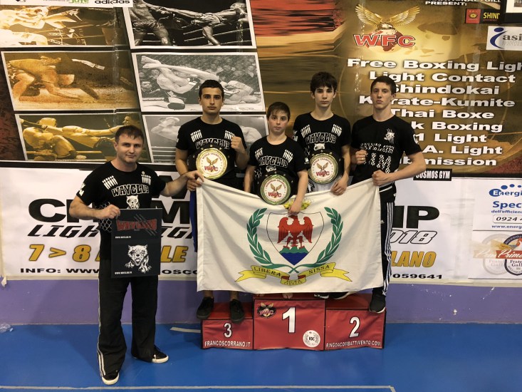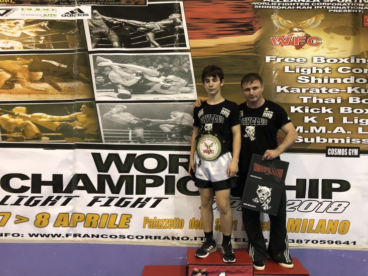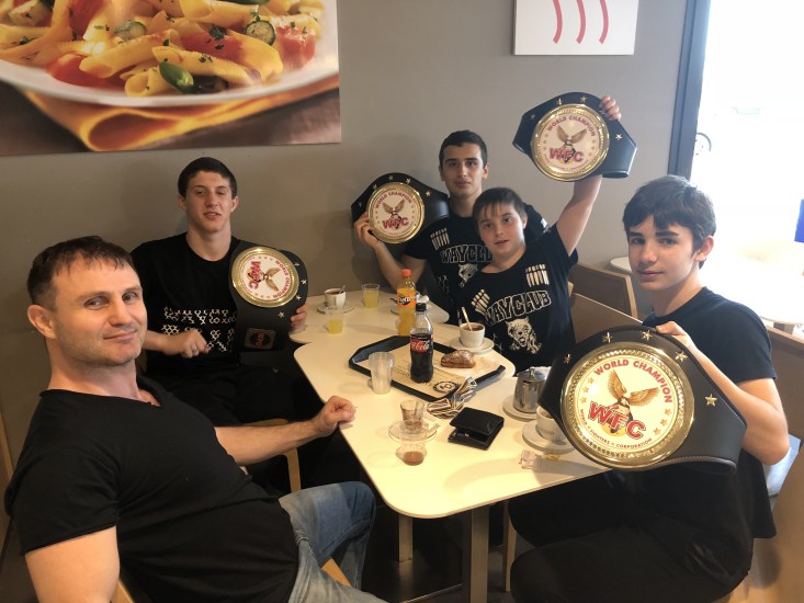 Retour du Wayclub du Championnat du Monde WFC à Milan en Italie des 7 et 8 avril 2018. Le Wayclub a amené 4 « petits loups » et a ramené 4 ceintures mondiales en MMA light, Free Boxing Light et K1 light. Certains de nos participants ont combattu dans plusieurs disciplines et auraient pu avoir plus de ceintures mondiales. Mais l’anarchie des jugements était – encore une fois – illimitée, jamais nous n’avons laissé de telles choses sans prendre des mesures dans l’histoire du Wayclub, ainsi des contestations sont en cours de préparation. La route : Comme presque toujours, Mago conduisait dans sa voiture personnelle pour sauver le budget du club et avec l’aide des parents. L’hôtel à louer avait 4 étoiles, mais un peu loin du centre pour payer moins cher. Mago a rencontré le Président de la WFC, qui organise ces championnats du Monde et s’est mis d’accord pour un partenariat Il sera donc plus facile pour nous d’amener nos élèves à combattre pour des titres. C’est le travail de Wayclub d’avoir des partenariats et l’une des raisons pour lesquelles les gens veulent intégrer ce club. Pourquoi nos enfants gagnent-ils dans différentes disciplines ? Nous engageons des partenariats et nous contactons les bons spécialistes si nous n’avons pas de bonnes compétences dans telle ou telle discipline. Ainsi, Adam ASKHAPOV et Malik KAIKHAROV s’entrainent au sol dans notre club partenaire « Boxing Squad » où nous avons envoyé Mehdi Dakaev aussi, pour qui il sera plus facile d’être en mesure de faire une carrière. Nous tenons à remercier leurs entraîneurs et amis Aldrik Cassata, Saif, Miguel.