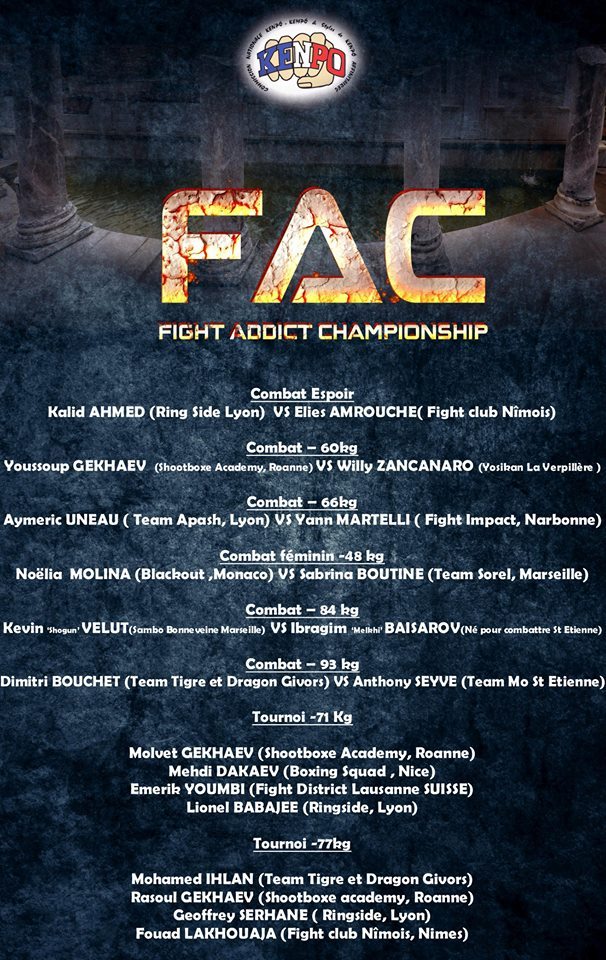 10-го октября в городке Сен-Роман-ан-Гал во французском регионе Рона-Альпы состоялся турнир “Fight Addict Championship” по смешанным единоборствам. В нем принимали участие несколько вайнахских бойцов из разных регионов Франции. В весовой категории 71 кг собралось четыре бойца, в числе которых были Мехди Дакаев, представляющий клуб Boxing Squad из Ниццы и Мовлет Гехаев из Shootboxe Academy города Роан. Победив остальных соперников, Дакаев и Гехаев встретились в финале. Первый раунд Гехаев провел активно и выглядел предпочтительнее соперника. Однако, во втором раунде Мехди, который, несмотря на молодой возраст, является опытным бойцом, сумел переломить ход боя и вырвать победу.